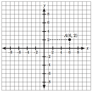 In the figure, point A has been assigned the ordered pair The number 6 corresponds to the point of intersection of the x-axis and the vertical line that passes through A. The number 2 corresponds to the point of intersection of the y-axis and the horizontal line that passes through A.