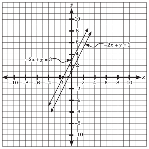 The two lines have the same slope, which is equal to 2; however, they have different y-intercepts, which are 1 and 3, respectively. Hence, the two lines are distinct parallel lines, as shown in the graph below.