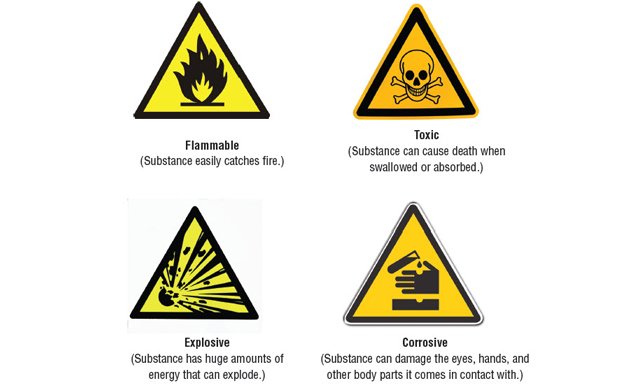 Before using any materials or substances in a container, read the labels on the container. Pay attention to signs and symbols in the labels because they indicate how the container’s contents are to be handled. Some of the common signs and symbols and their meanings are as follows: