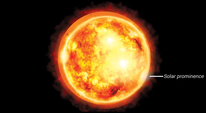 During a solar eclipse, prominences may be observed as reddish clouds hanging above the sun. They may reach as high as 50 000 km above the corona and remain suspended for several months. When they reach this height, they produce coronal mass ejections, or bursts of explosions that send large amounts of material to space at the speed of 1000 km per second.