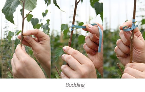 Budding is done by choosing and cutting a bud from one plant and attaching it to another plant. The bud must be fitted well to the mother plant. When the bud is big enough, it becomes part of the mother plant. Rose plants and most fruit-bearing trees are propagated by this technique.