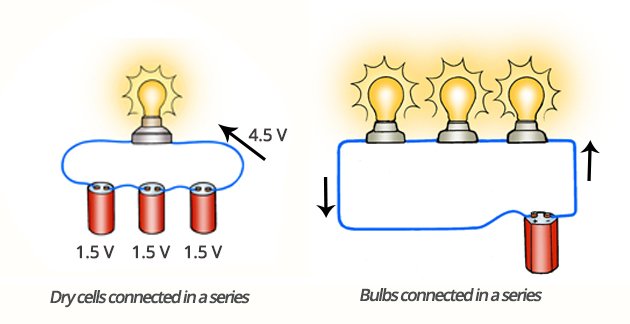 When bulbs are connected in a series, electric current flows only in one direction; that is, from the dry cell to the first bulb, then to the second bulb and the third bulb, and finally back to the source. If a single load is loosened or damaged, the rest of the loads will not function because the circuit is cut or open. For example, Christmas lights are connected in a series.