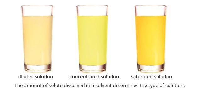 A solution can be classified according to the amount of solute and solvent it contains. It can be diluted, concentrated, or saturated.