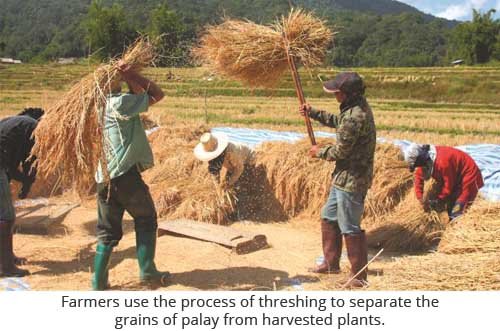 After harvesting, farmers thresh palay to separate the grains from the harvested plants by using a threshing machine. Before the invention of the threshing machine, farmers manually performed threshing.
