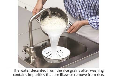 liquid component from one container to another, without disturbing the lower layer or sediments in a mixture. Decantation is used to separate solids from liquids. For example, the sand in a sand-and-water mixture can be separated from water by letting the sand settle at the bottom of the container and then carefully pouring the water into another container. Decantation is also applied when washing rice grains before cooking. In this process, water is poured out slowly from the pot, leaving the rice grains behind.