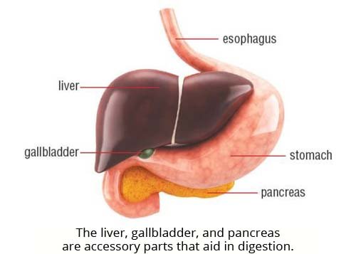 The pancreas produces pancreatic juices that act on starch and fat. The liver produces a greenish fluid called bile, which is stored in the gallbladder and released when food enters the small intestine. Bile helps to digest fats. After digestion, carbohydrates are changed to glucose, proteins are changed to amino acids, and fats are changed into fatty acids.