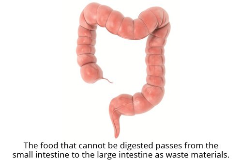 The large intestine is about 1.5 m to 1.8 m long and forms like an inverted U around the coils of the small intestine. From the small intestine, undigested food is passed to the large intestine where it is stored temporarily. In the large intestine, extra water is absorbed and solid waste or feces is transported to the rectum until it leaves the body through the anus.