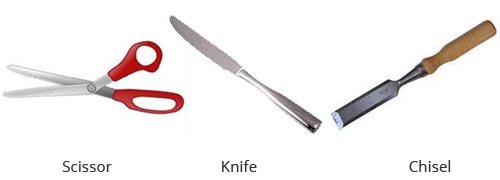 The wedge consists of at least one slanting side ending in a sharp edge, which breaks or cuts things apart. It is a moving inclined plane. The pointed edge of the inclined plane can be used to push things apart. Knives, scissors, and chisels are examples of wedges.