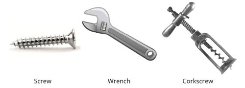 The screw is an inclined plane wrapped around a cylinder. It holds things together or lifts objects. As the screw is turned around by a tool such as a screwdriver, it separates the wood or metal from the surface to which they are attached. Nuts and bolts, drill bits, jackscrews, wrenches, and corkscrews are examples of screws.