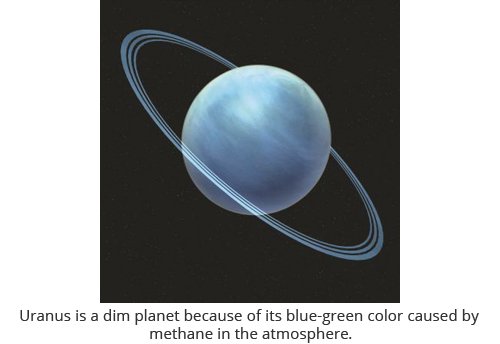 Uranus is the seventh giant planet from the sun and the third largest planet in the solar system. Its atmosphere consists of 84% hydrogen, 14% helium, and 2% methane. Methane makes the planet appear a bluish green in color. Its surface is made of liquid hydrogen and helium. Next to the surface is a layer of highly compressed water and its core is made up of rocks.