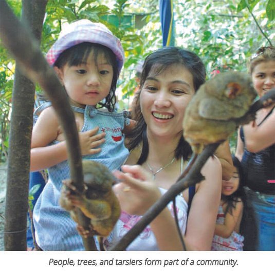 A community is made up of all the different populations of different species that interact and coexist in a specific area. The group of tarsiers in the forests of Bohol and the humans, plants, and other animals with which they interact in Bohol, comprise a community.