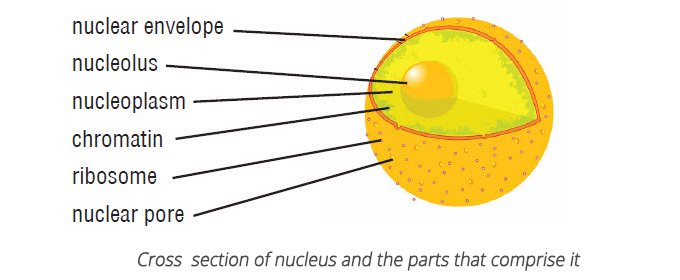 The nucleus is made up of the nuclear envelope, nucleolus, chromatin, ribosomes, and nuclear pores.