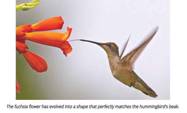 Coevolution occurs when two or more interacting members of a community evolve in such a manner that they end up matching one another in terms of physical features. This is clearly seen in the case of hummingbirds and the flowers of the fuchsia plant.