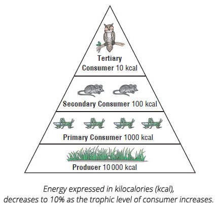 Generally, the amount of energy transferred from one organism to another is reduced to about 10%. For instance, when a herbivore consumes grass with 100% energy, the herbivore only acquires 10% energy, and the carnivores that feed on the herbivore receive no more than 1% of the original energy content. This can be explained by the fact that organisms use some of the energy to maintain life processes, while releasing some energy into the environment as heat. The energy pyramid further suggests that due to the minimal amount of energy received, only few carnivores are sustained in a food web.