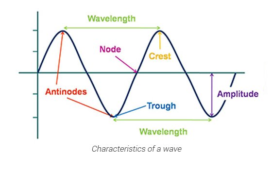 The distance between two successive crests or troughs (first and second, second and third, and so on) is called wavelength. It is represented by the symbol λ and is expressed in meters (m).