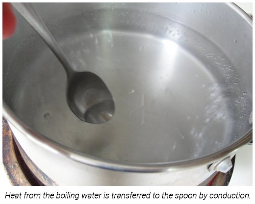 Metals are the best conductors of heat because they have many free electrons that vibrate and easily come in contact with other electrons, thereby making heat transfer much easier. Cloth, wood, and plastic are examples of insulators, or poor conductors of heat. Think of a metal spoon left in a pan of boiling water. After a while, even the part of the spoon that was not submerged in the boiling water has also become hot.